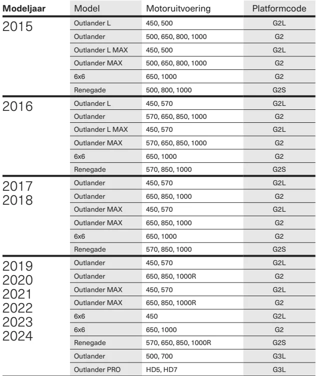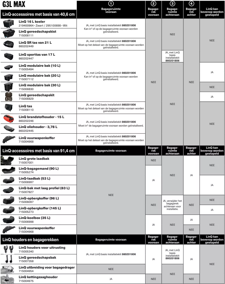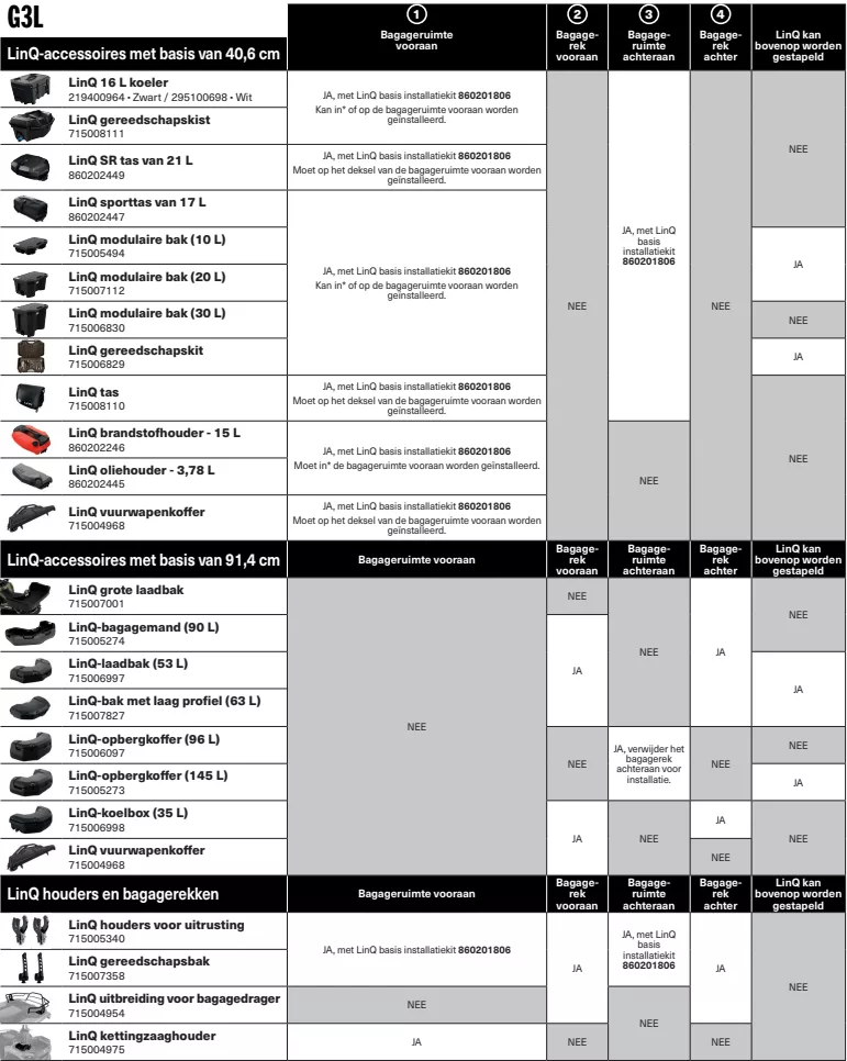 - G3L (zie tabel of het met de quad past)